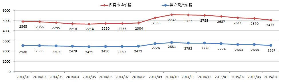 國內(nèi)氧化鋁現(xiàn)貨交易市場趨于下跌。4月份上期所三月期鋁結(jié)算價加權(quán)平均值為13238.94元/噸,以17.3%作價4月份氧化鋁長單價為2275.02元/噸。1-4月份國內(nèi)氧化鋁現(xiàn)貨價格和西南市場價格持續(xù)處于下跌趨勢,4月份下跌幅度分別為71元/噸、98元/噸。再加上部分地區(qū)氧化鋁現(xiàn)貨價格逐步接近長單比例價,并且氧化鋁企業(yè)利潤空間急劇縮水并貼近成本。預(yù)計氧化鋁市場將會迅速恢復(fù)理性走勢,價格也將止跌企穩(wěn)。