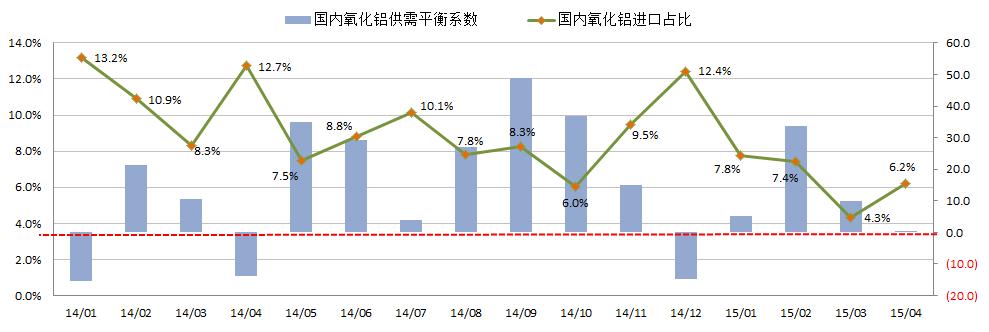 圖3:我國氧化鋁供需平衡系數(shù)及國內(nèi)氧化鋁進口占比變動圖