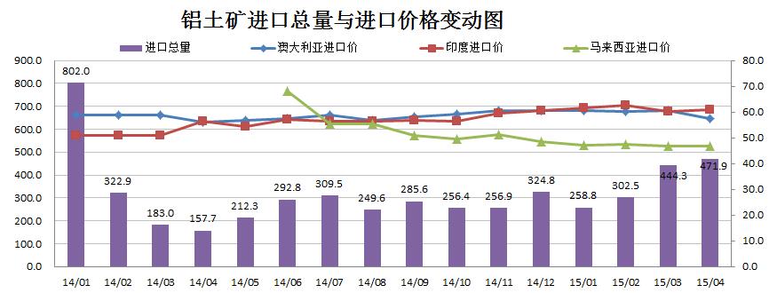 鋁土礦進口價格或持續(xù)穩(wěn)中有降態(tài)勢。近兩個月我國的鋁土礦進口量都維持在較高的水平。監(jiān)控數(shù)據(jù)顯示,2015年4月份我國鋁土礦進口量猛然上漲至471.9噸,同比增長199.2%,環(huán)比增長6.2%。其中,澳大利亞、印度和馬來西亞為主要的進口國,其進口量占比高達93.6%,進口價格保持穩(wěn)定并略有下降。預(yù)計鋁土礦進口價格將保持穩(wěn)中有降趨勢,但下降幅度不會很大。