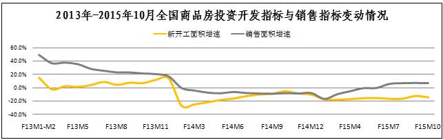 發稿時間:2015-11-20全國市場方面:國家統計局數據,10月份全國商品房新開工面積累計同比降幅為-14.7%,跌幅環比擴大2.1個百分點,銷售面積累計同比增速為7.2個百分點,增幅環比下跌0.3個百分點。10月份全國房地產投資開發指標與銷售指標表現不佳,拖累國房景氣指數連續兩個月下跌,其中10月份國房景氣指數為93.34,較9月份下跌了0.06點。