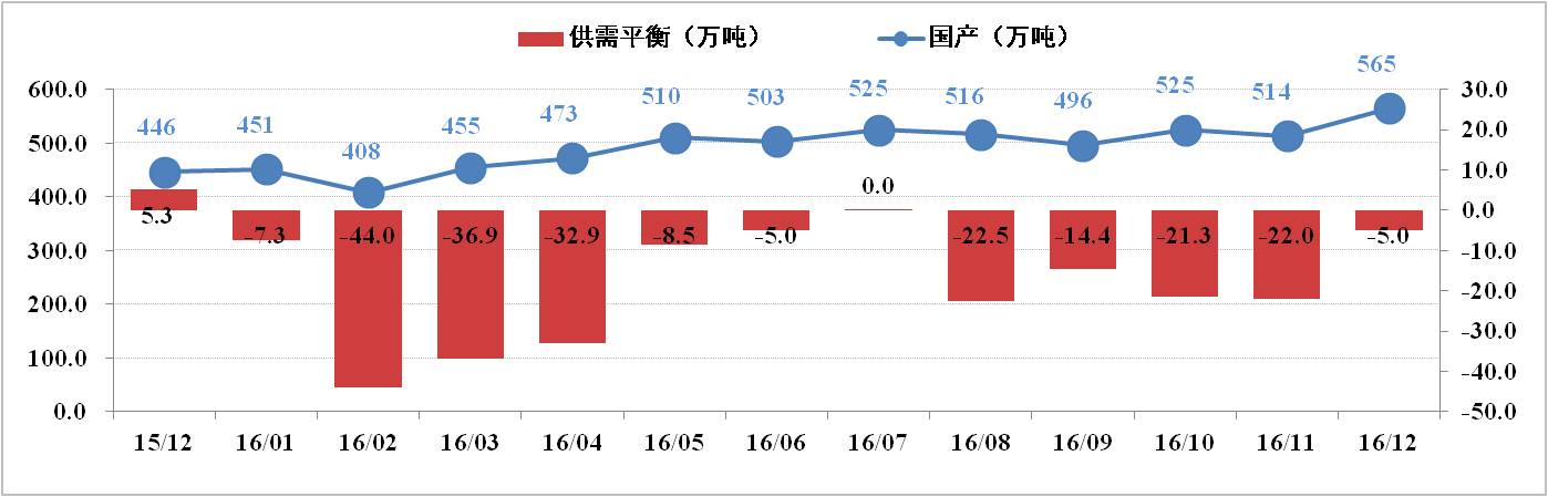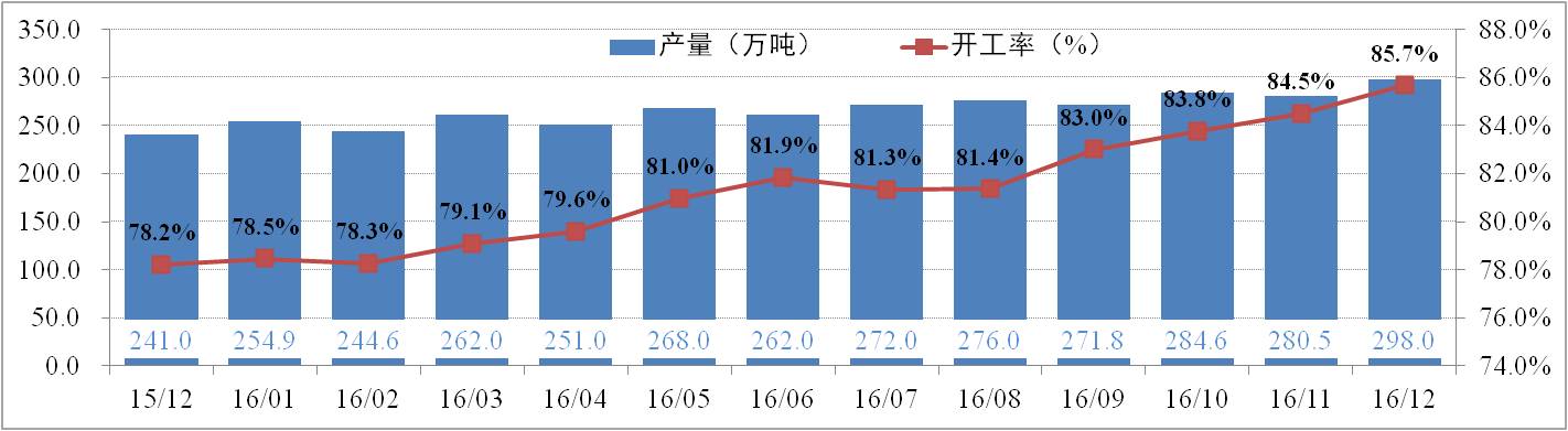 供給方面:12月份全國電解鋁有效產能為4,219.5萬噸,運行產能3,615.3萬噸,開工率為85.68%。其中,12月份電解鋁總產量為294.2萬噸,日化產量9.49萬噸,供應持續增加。調研數據顯示,2016年國內電解鋁已累計減產88.4萬噸;累計復產242.55萬噸,待復產約60萬噸;新產能已投產393.8萬噸,待投產71萬噸。