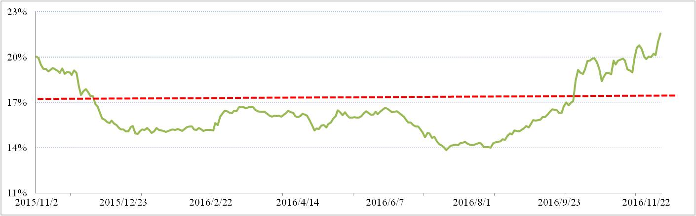 滬鋁三月比例價方面,11月滬鋁三月合約下行趨勢明顯,月末加權平均價報收于13,118元/噸。若按17.6%氧化鋁作價比例,2017年1月份全國氧化鋁長單加權價格為2,309元/噸,與現貨加權價格的價差擴大到646元/噸。12月份期鋁全國氧化鋁現貨加權價與滬鋁三月加權平均價實際折算比例為22.95%。