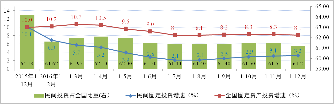 據(jù)國家統(tǒng)計局統(tǒng)計數(shù)據(jù)顯示,2016年1-12月,全國固定資產(chǎn)投資同比名義增長8.1%,環(huán)比回落0.2個百分點(diǎn)。民間固定資產(chǎn)投資同比名義增長3.2%,環(huán)比上升0.1個百分點(diǎn)。民間固定資產(chǎn)投資占全國固定資產(chǎn)投資(不含農(nóng)戶)的比重為61.2%,環(huán)比下降0.3個百分點(diǎn)。