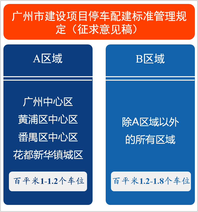 11月17日,廣州市政府發(fā)布《廣州市建設(shè)項(xiàng)目停車配建標(biāo)準(zhǔn)管理規(guī)定(征求意見稿)》。規(guī)定新建、改建、擴(kuò)建的住宅類建設(shè)項(xiàng)目及大于500平方米的公共建筑類、工業(yè)建筑類建設(shè)項(xiàng)目,按A、B兩區(qū)域進(jìn)行劃分規(guī)定。