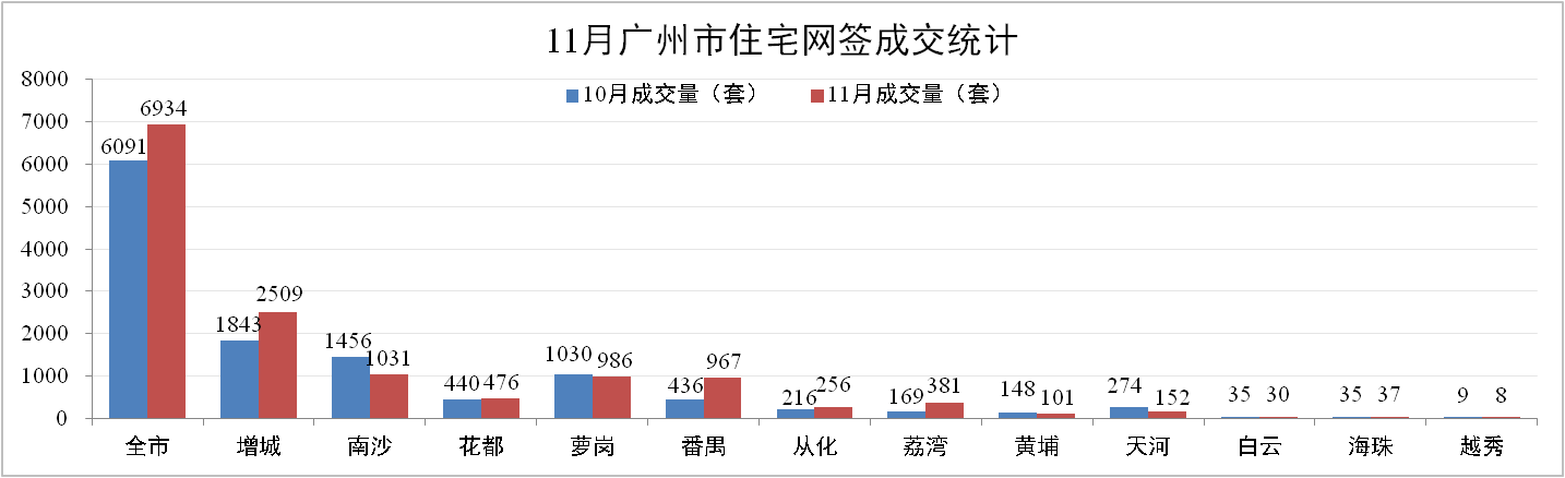 11月,廣州一手住宅網簽量成交6,934套,同比下降26.69%,環比上升13.84 %,大盤整體帶動市場上揚。