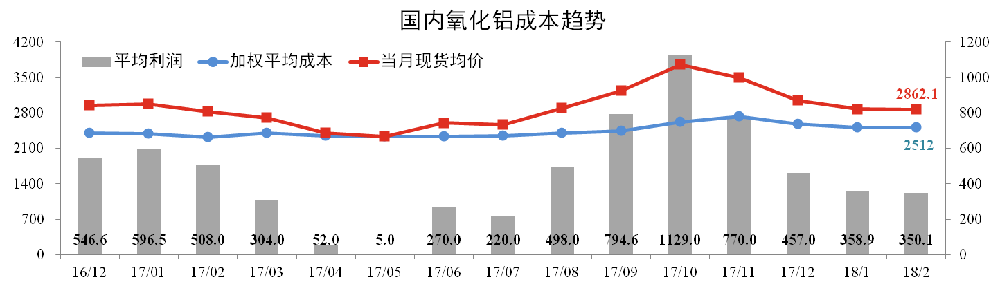 2月份國內氧化鋁加權平均成本為2,512元/噸,環比下跌0.12個百分點。當月全國氧化鋁現貨成交均價為2,862.1元/噸,較上月下跌0.41%。理論上,氧化鋁行業平均利潤水平為350.1元/噸。