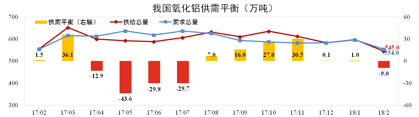 截至2月底,我國氧化鋁建成產能8,162萬噸,運行產能6,792萬噸,開工率83.21%,環比上升0.68個百分點。其中國內氧化鋁產量529萬噸,進口氧化鋁16萬噸,供給總量545萬噸,測算的需求量為554萬噸,理論短缺9萬噸。