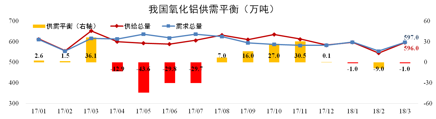 截至3月底,我國氧化鋁建成產能8,162萬噸,運行產能6,792萬噸,開工率83.21%,環比上升0.68個百分點。其中國內氧化鋁產量586萬噸,進口氧化鋁10萬噸,供給總量596萬噸,測算的需求量為597萬噸,理論短缺1萬噸。