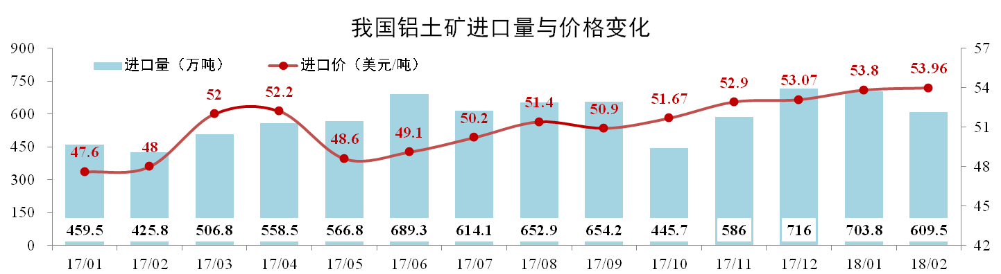 2月份我國鋁土礦進口量為609.5萬噸,同比增長43.14%,環比下降13.4%。進口均價53.96美元/噸,環比上漲0.3%。當月主要進口國幾內亞鋁土礦開采經歷短暫暴力示威,進口量微降至 342 萬噸,占當月總進口量的56.06%。