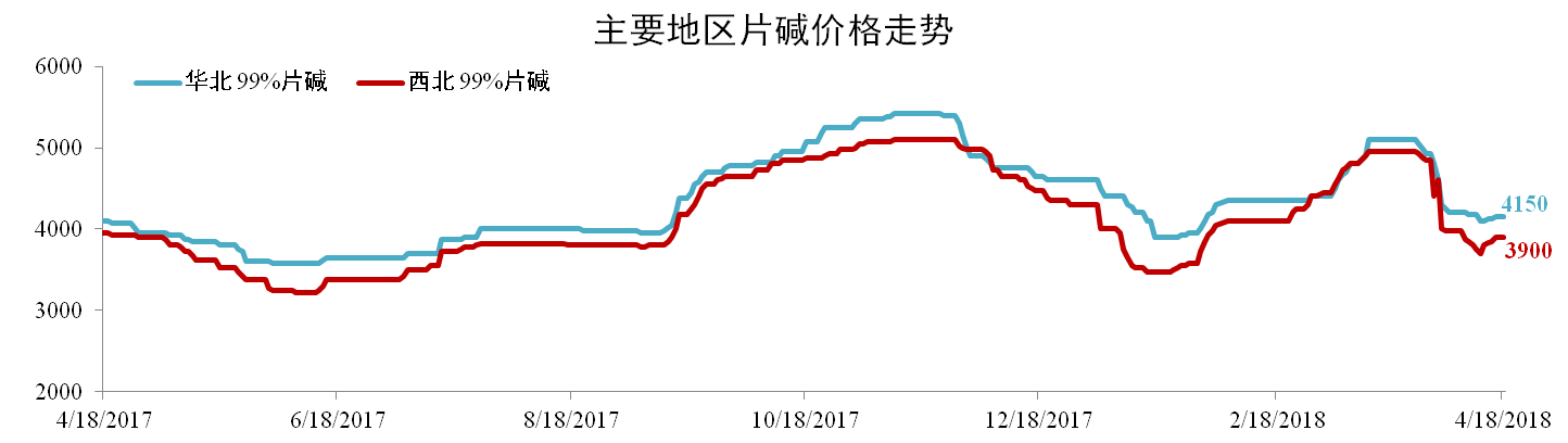 3月受市場供需基本面主導,片堿價格沖高后回落。截止2018年4月18日,華北99%片堿價格報4150元/噸,環比下跌18.63%,西北99%片堿價格報3900元/噸,環比下跌21.21%。