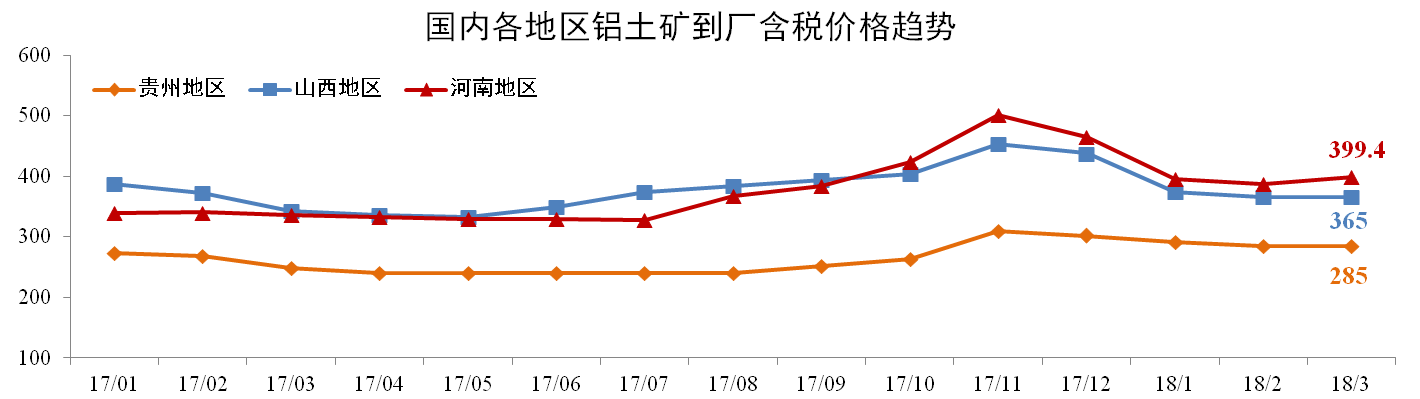 3月份各地鋁土礦價格保持穩定。截止2018年3月,貴州(AL:60%,A/S:5.5-6)到廠含稅價月均價285元/噸,環比無變動;山西鋁土礦365元/噸,環比無變動;河南鋁土礦399.4元/噸,環比上漲3.07%。