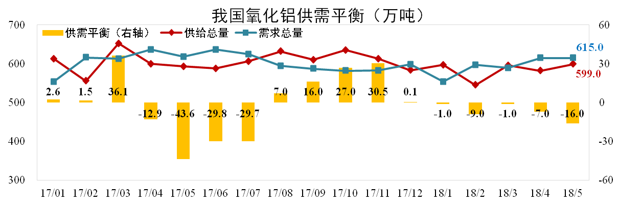 發(fā)稿時間:2018-06-22截至5月底,我國氧化鋁建成產(chǎn)能8167萬噸,運行產(chǎn)能7297萬噸,開工率89.35%,環(huán)比上升1.17個百分點。其中國內(nèi)氧化鋁產(chǎn)量607萬噸,進口氧化鋁8萬噸,供給總量599萬噸,測算的需求量為615萬噸,理論短缺16萬噸。