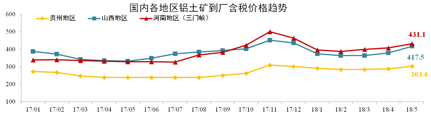5月份各地鋁土礦價格均小幅度增長。截止2018年5月,貴州(AL:60%,A/S:5.5-6)到廠含稅價月均價303.4元/噸,環比上漲5.16%;山西鋁土礦417.5元/噸,環比上漲9.87%;河南鋁土礦431.1元/噸,環比上漲5.58%。